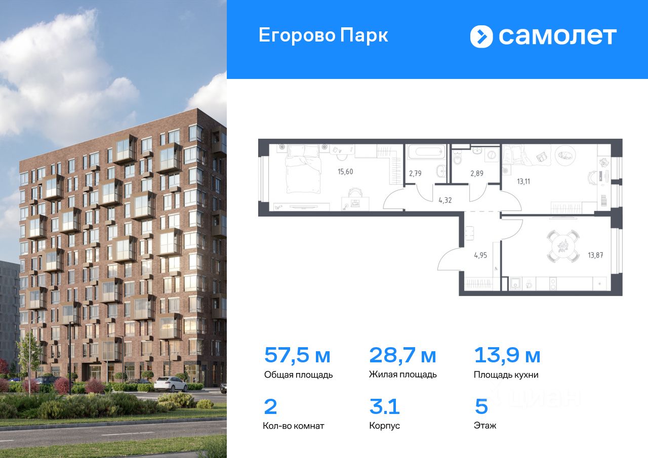 Строим кварталы для жизни с заботой о будущем. Предлагается 2-комнатная квартира комфорт-класса 57,53 кв.м в корпусе 3.1 на 5 этаже, в ЖК ''Егорово Парк''