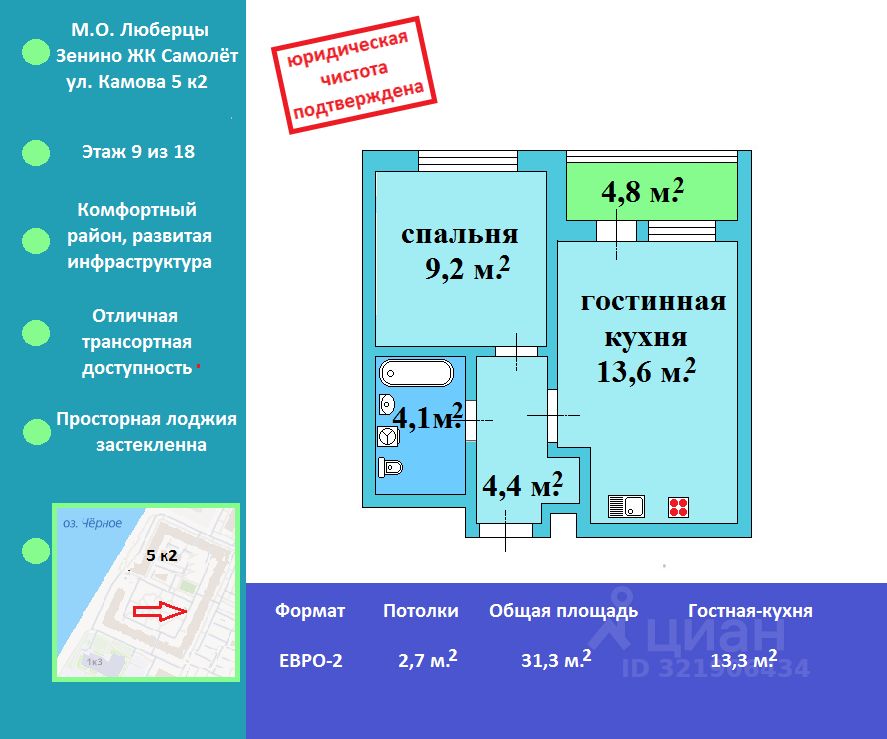 Уютная, светлая квартира формата ЕВРО-2 в тихом районе. Тёплый дом, комфортный этаж, адекватные соседи. Отличная планировка и просторная тёплая лоджия, которую, после небольшой доработки, можно использовать как рабочий кабинет. Удобно сформировавшаяся инфраструктура отвечает как торгово - развлекательным вопросам, так и административно - деловым требованиям. В пешей доступности детские, спортивные площадки, зелёные массивы и Чёрное озеро. Один взрослый собственник. Хорошие документы - ДДУ от застройщика. Профессиональная помощь покупателю без специалиста. Содействие в получении специальных условий и преференций по ипотеке. В случае оформлении ипотечного кредита в Сбере, в рамках партнёрских отношений, преференция от банка в размере 0,3% от ежемесячного платежа. Звонки принимаются в режиме 24/7. Звоните. Искренне и честно отвечу на любые интересующие вопросы по объекту.