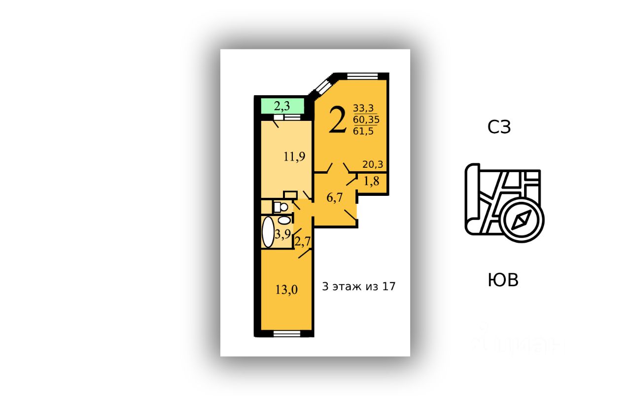 Окна выходят: кухня и большая комната на СЗ / маленькая комната на ЮВ