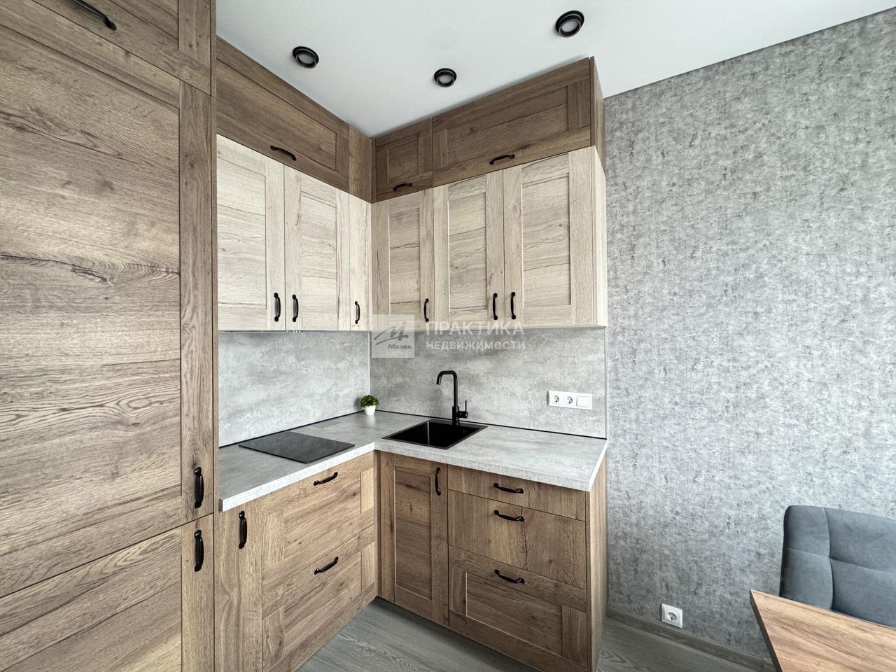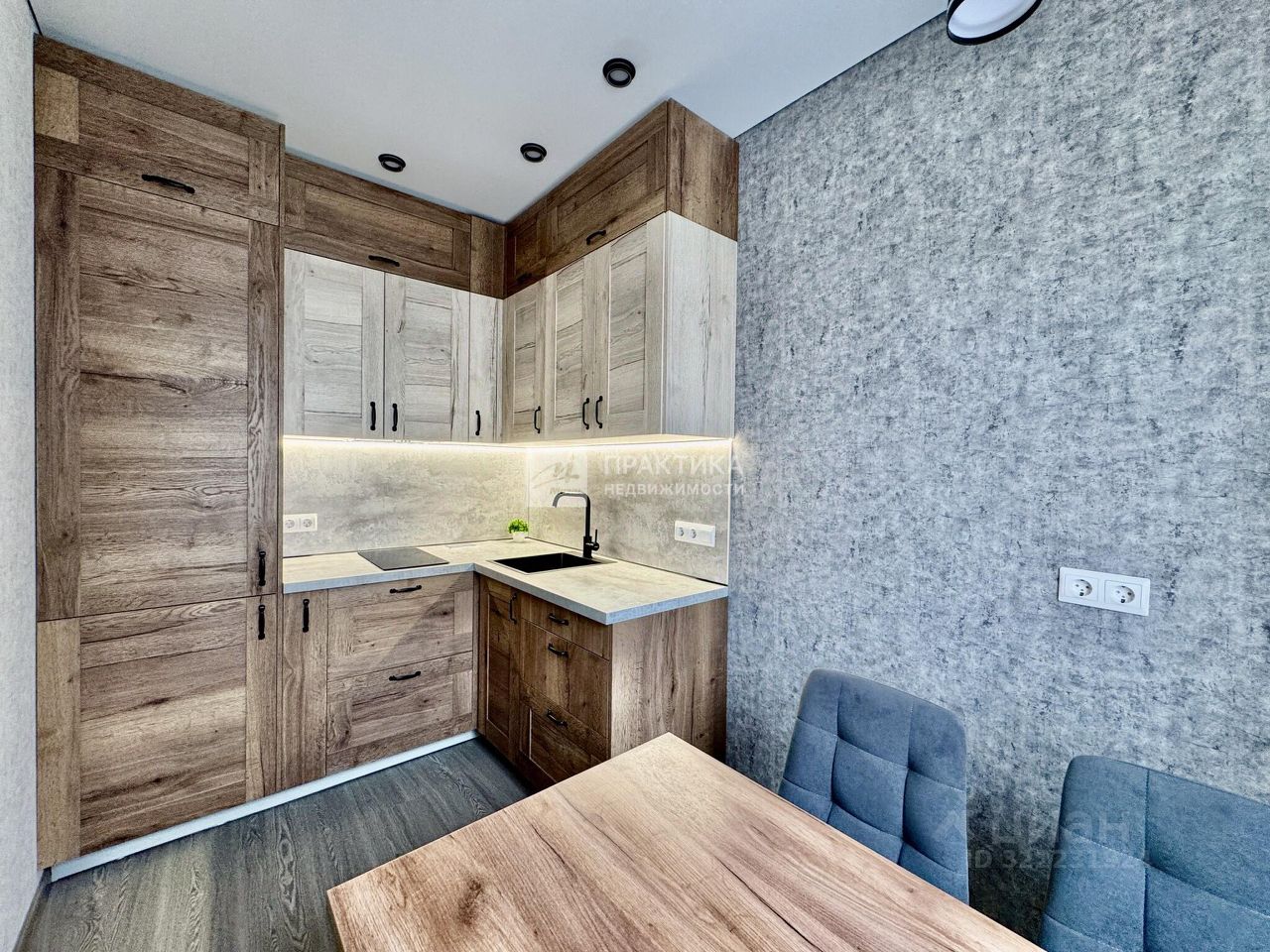 Кухня: -установлена встроенная кухня -двухкамерный холодильник -варочная поверхность -мойка -обеденный стол со стульями