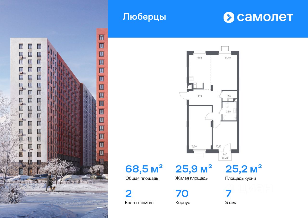 Строим кварталы для жизни с заботой о будущем. Предлагаются 2-комнатные апартаменты комфорт-класса 68,5 кв.м в корпусе 70 на 7 этаже, в ''Люберцы''