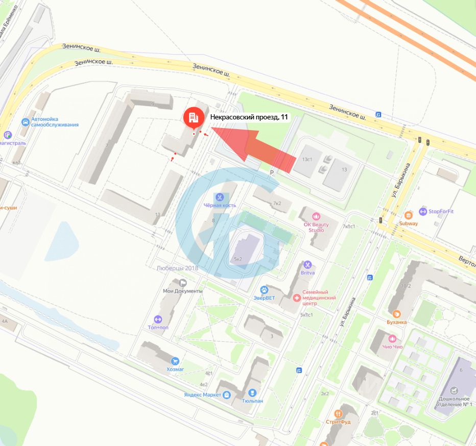 Находится на первой линии на въезде в ЖК с Зенинского шоссе.