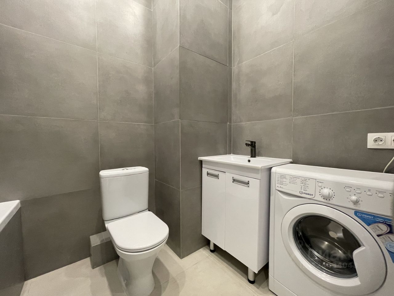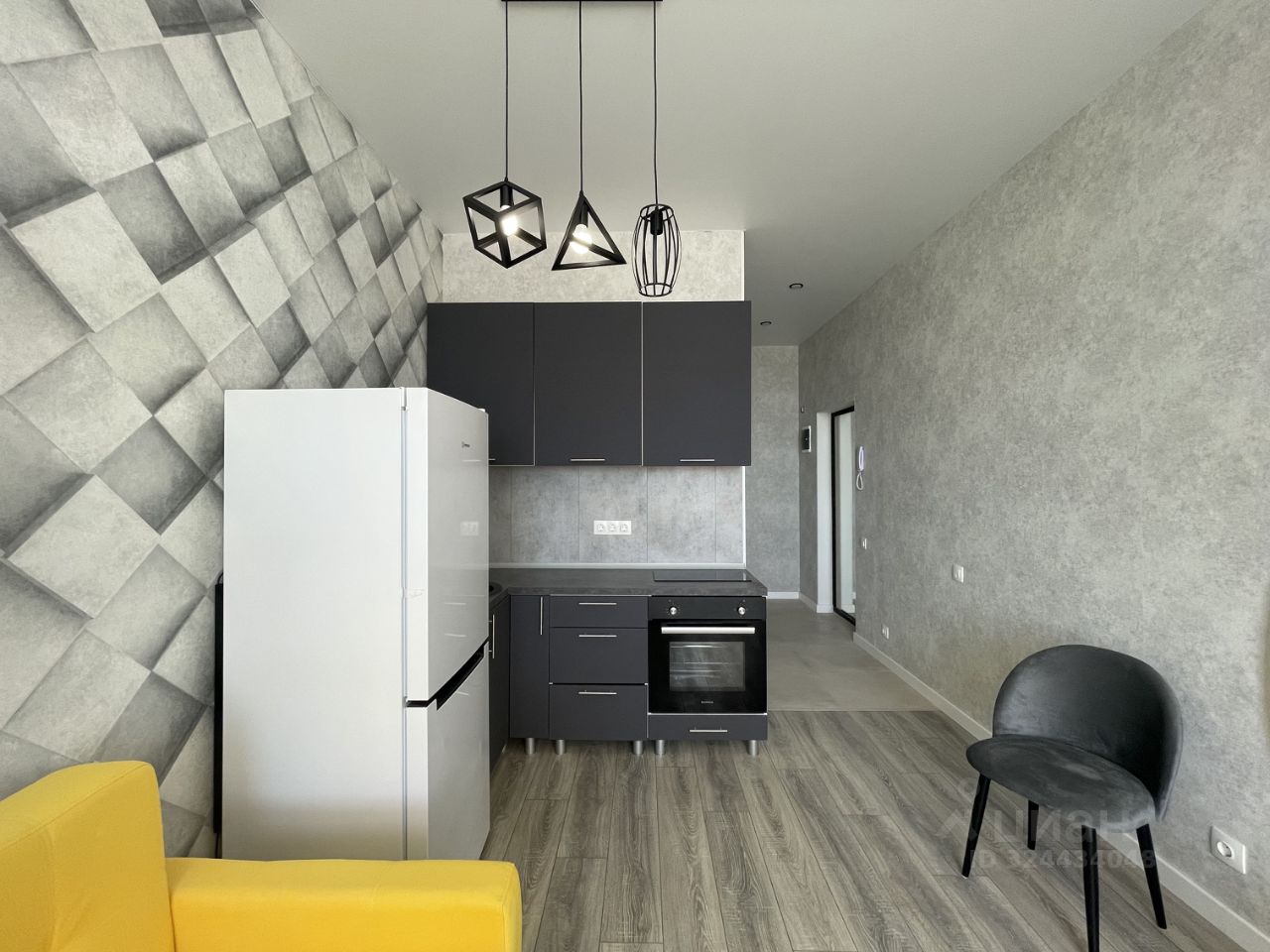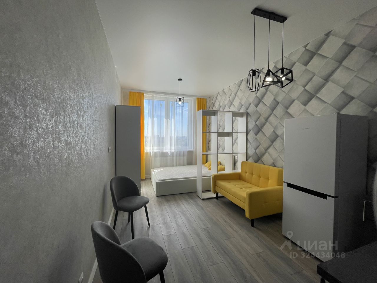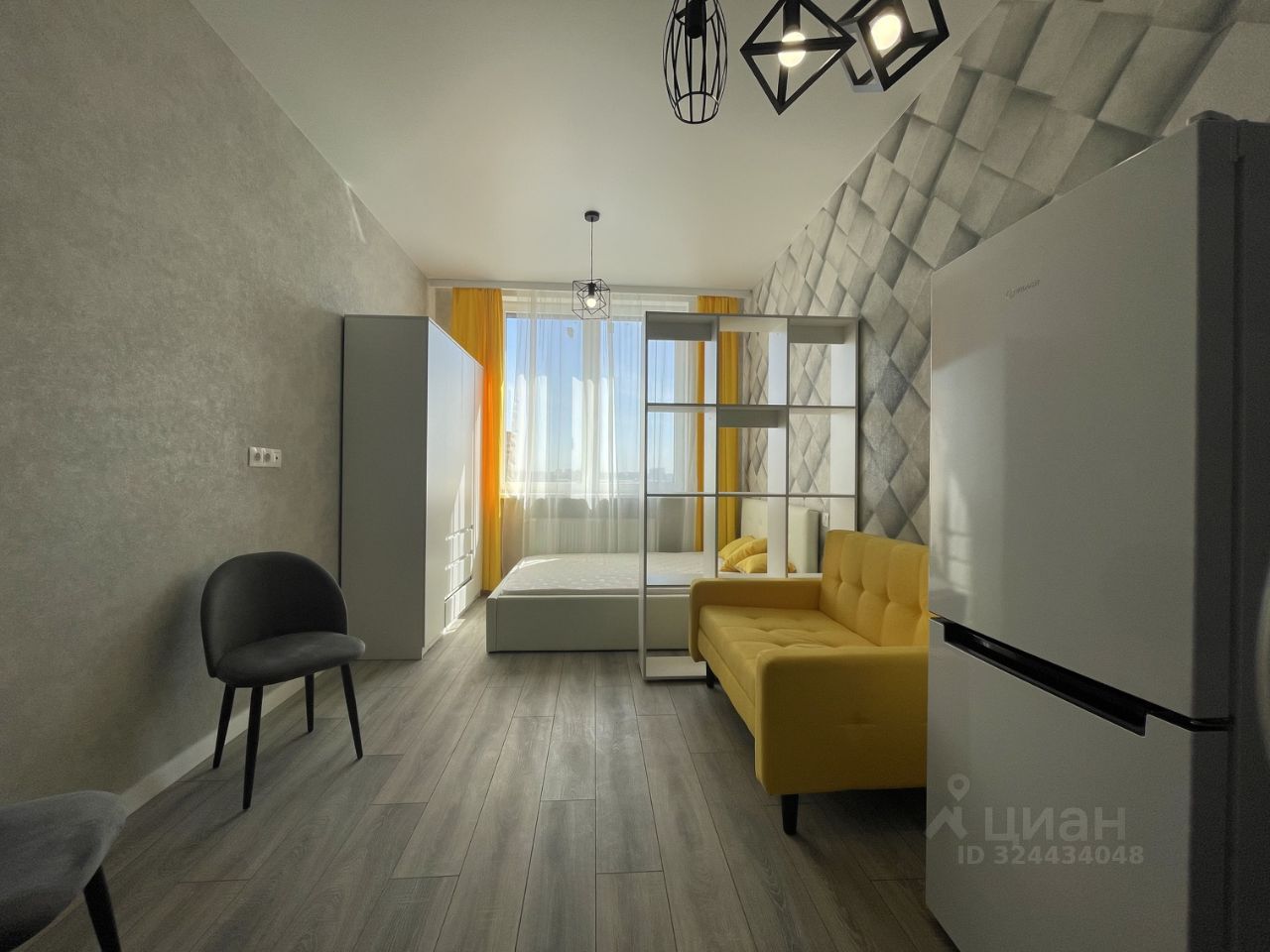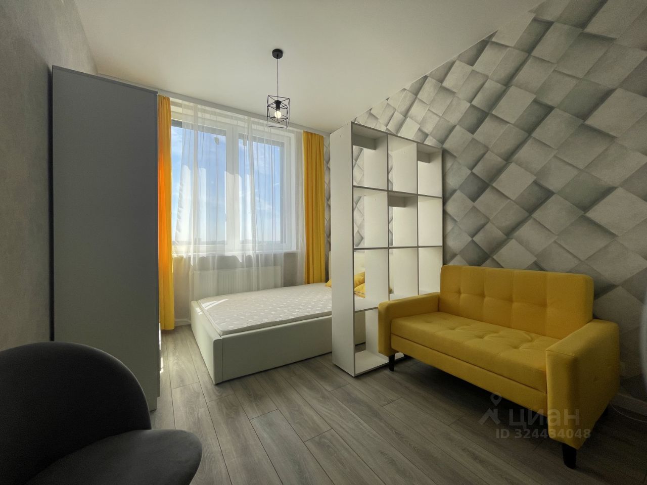 Студия укомплектована мебелью и техникой: в комнате двуспальная кровать, шкаф для одежды, раскладной диван, кухонный гарнитур с электрической плитой, духовым шкафом, холодильником, совмещенный санузел с ванной и стиральной машиной.