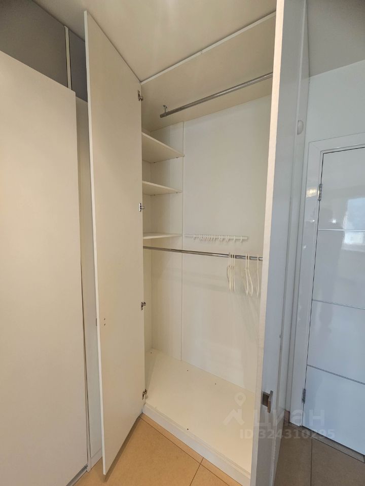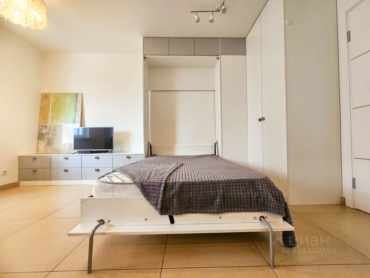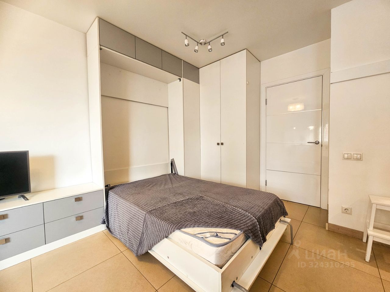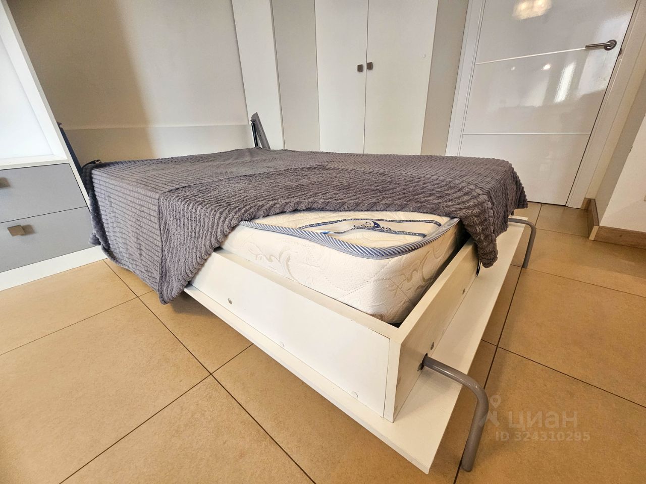 Также есть двуспальная кровать с ортопедическим матрасом, специальный подъемный механизм прячет ее в шкафу.