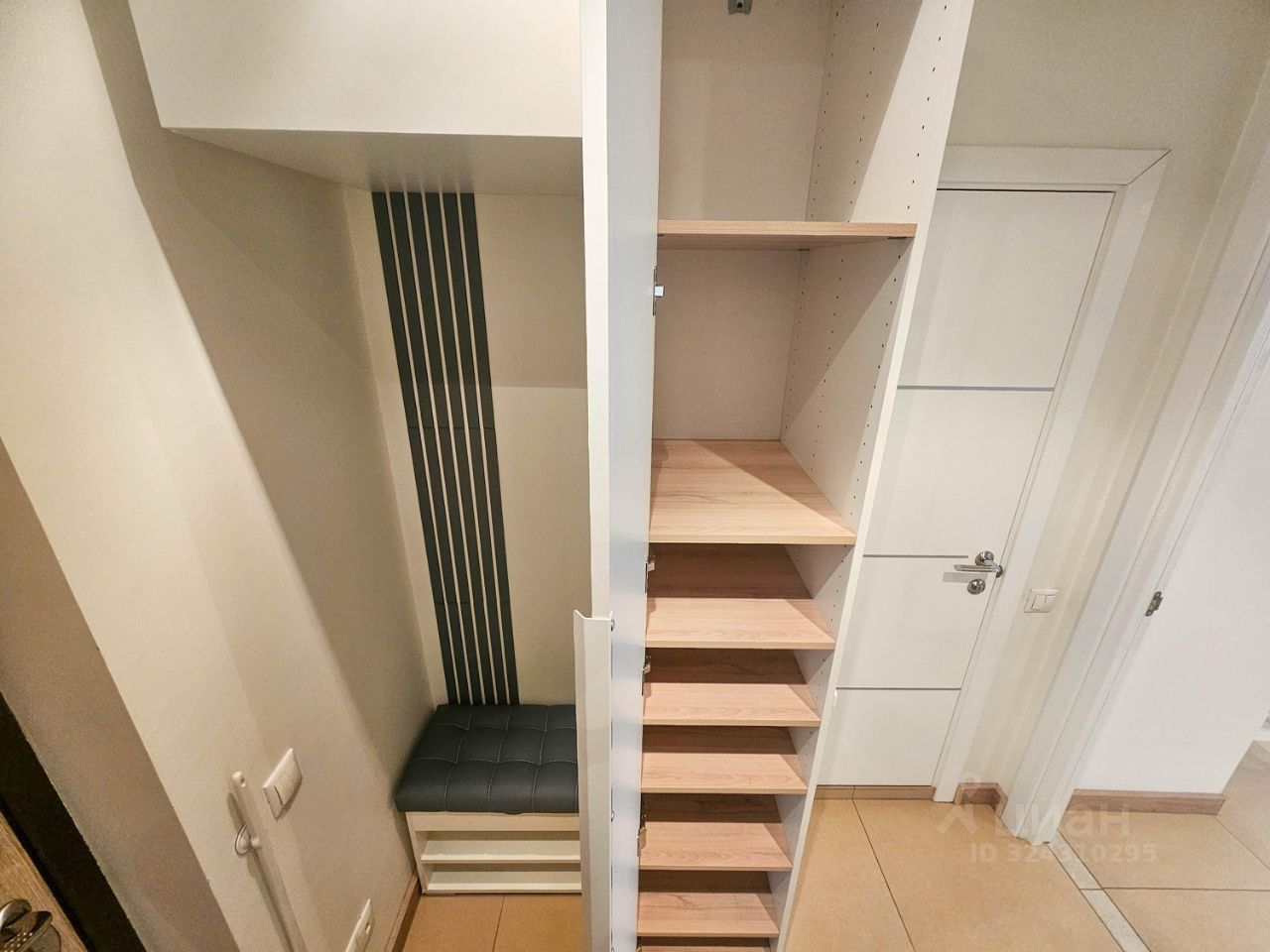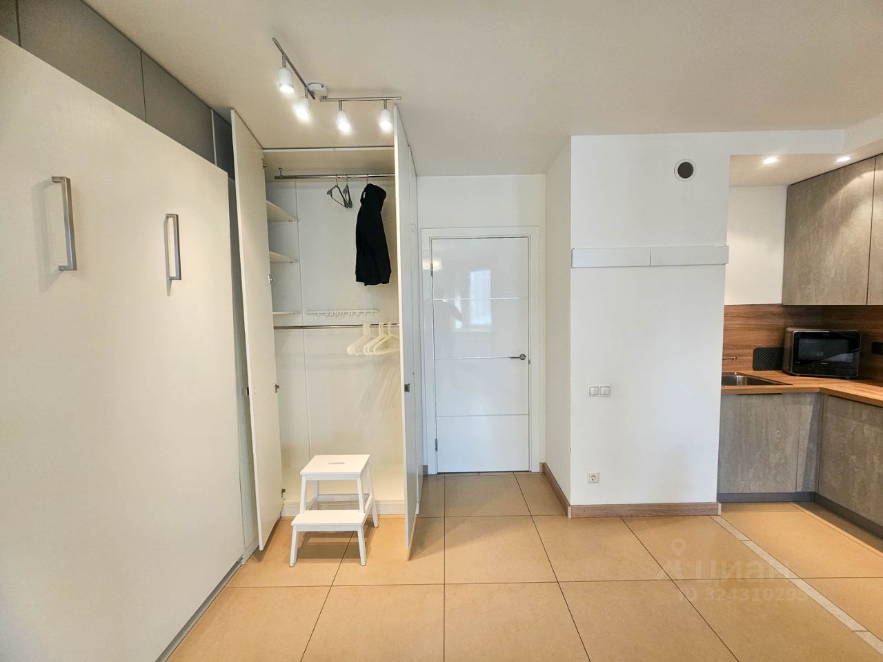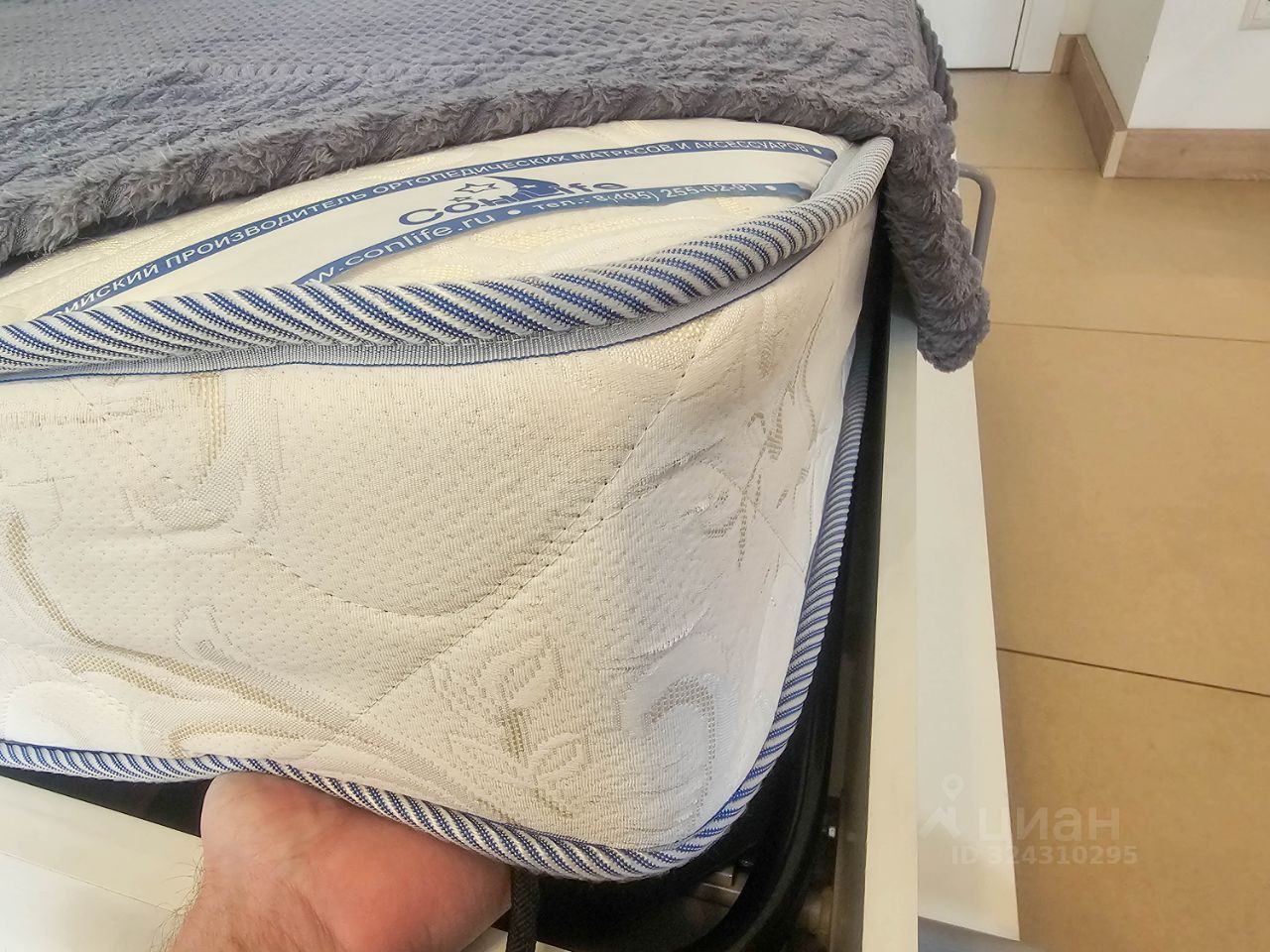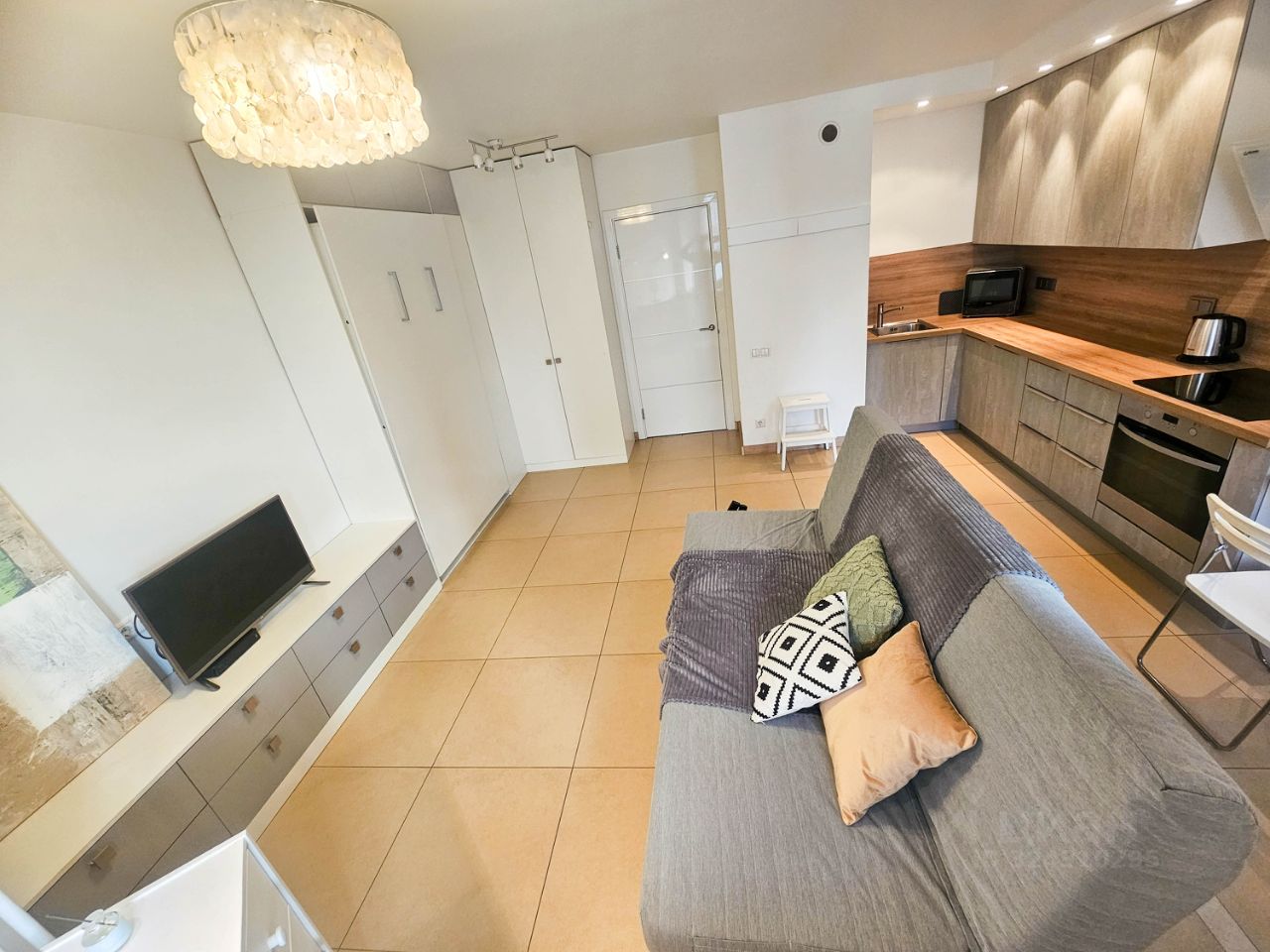 Также есть двуспальная кровать с ортопедическим матрасом, специальный подъемный механизм прячет ее в шкафу.