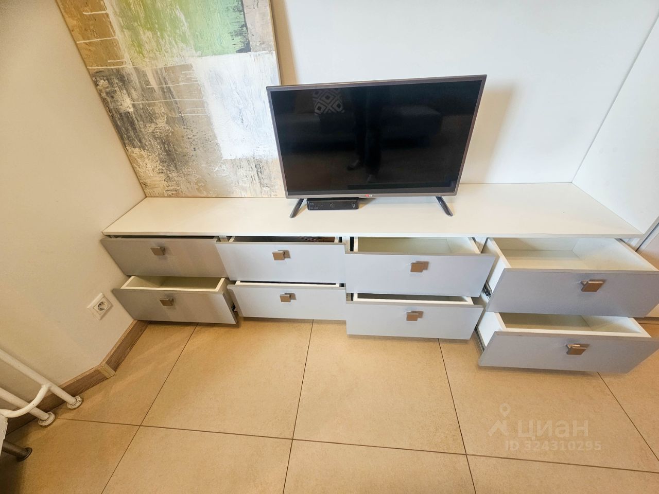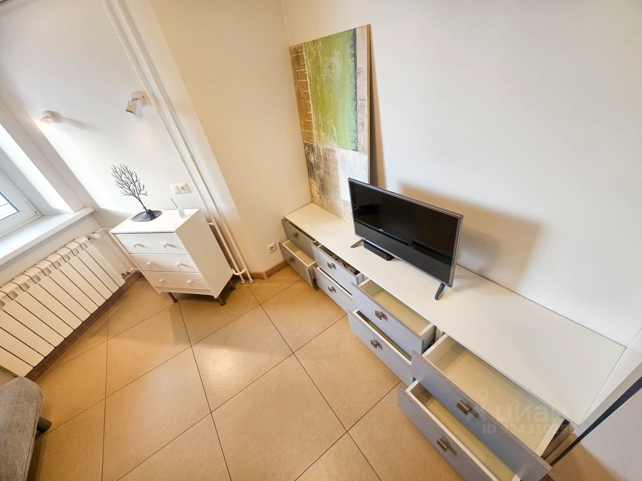 Места хранения - большой шкаф-купе в прихожей, шкаф в комнате, комод, подставка под ТВ с множеством полок.