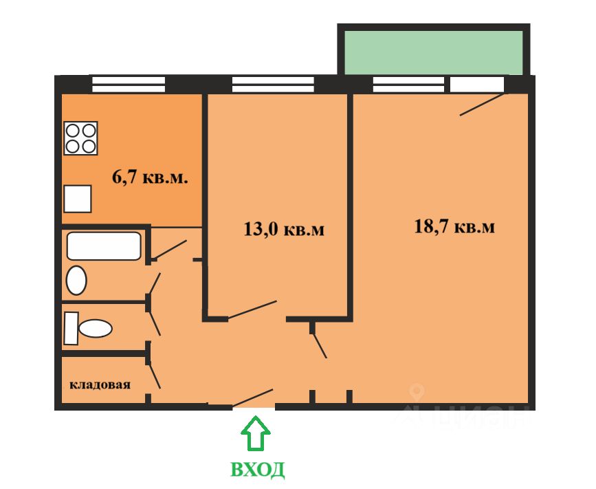 Продается 2-комнатная квартира. Общая площадь - 47,86 кв.м., жилая площадь -31,7 кв.м. (комнаты изолированные 18,7-13,0), кухня - 6,7 кв.м., большой балкон, раздельный саузел, кладовая. Окна смотрят во двор.
