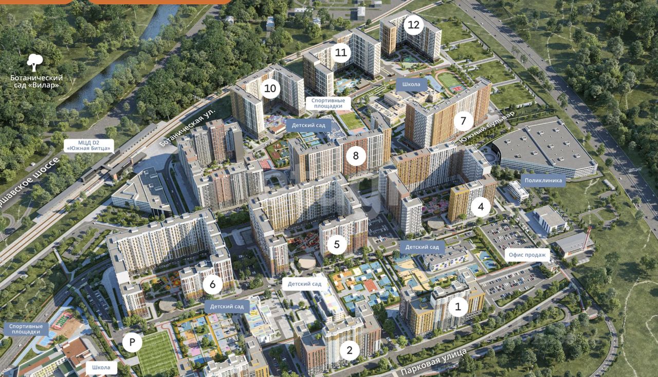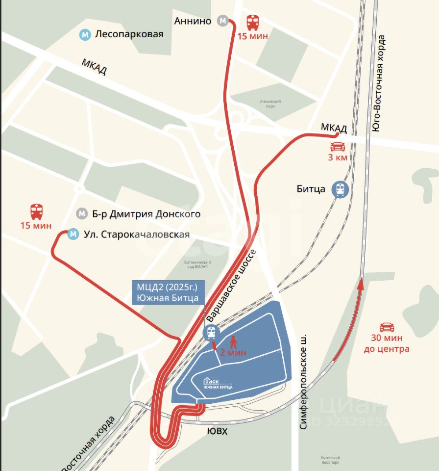 Жилой комплекс ''Южная Битца'' расположен в Ленинском районе Подмосковья, всего в 3 км от МКАД между Варшавским и Симферопольским шоссе, что обеспечивает отличную транспортную доступность. Открытие участка ЮВХ и съезда на МКАД напрямую от комплекса оптимизирует выезд на магистрали. В шаговой доступности находятся три станции метро — ''Аннино'', ''Бульвар Дмитрия Донского'' и ''Улица Старокачаловская'', а также станция МЦД-2 ''Бутово'', до которой можно доехать на маршрутном такси за 1015 минут. Перспективы развития транспортной инфраструктуры включают запланированное открытие новой станции Бирюлевской линии метро к 2028 году в непосредственной близости от ЖК.