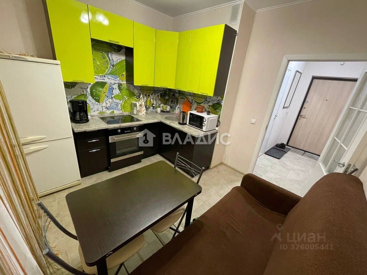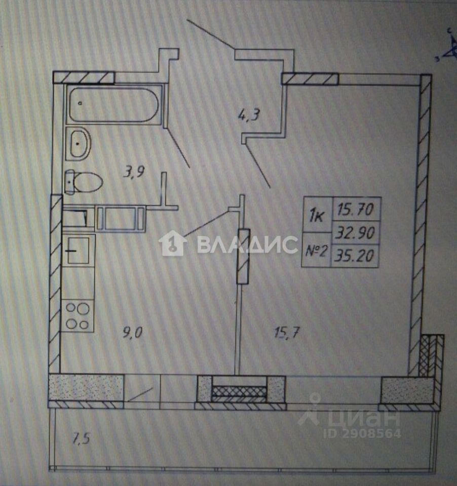 Квартира расположена на 9 этаже 17-этажного монолитного дома, построенного в 2018 году. Общая площадь составляет 32,8 кв. м, из которых 15,7 кв. м — жилая площадь, 9 кв. м — кухня. Высота потолков — 2,7 м, что создаёт ощущение простора.
