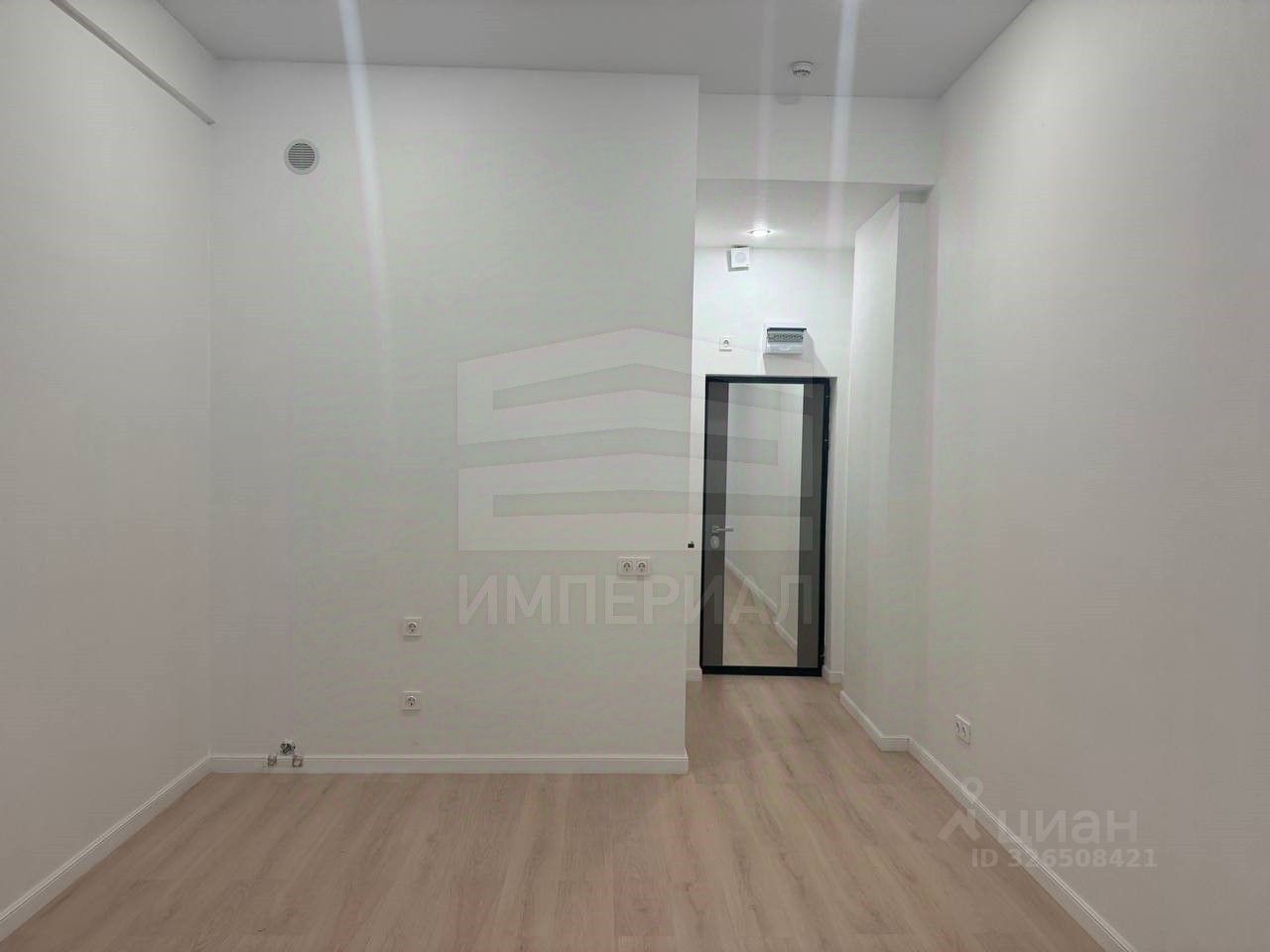 На стенах поклеены обои под покраску, на полу постелен ламинат с плинтусами и откосами. Есть вытяжная вентиляция в санузле и на кухне, выходы хв/гв, место под раковину на кухне. Кроме того, в помещениях уже есть выключатели освещения, розетки для бытовой техники и роутера, а также сделаны закладные для оптоволокна для интернета.